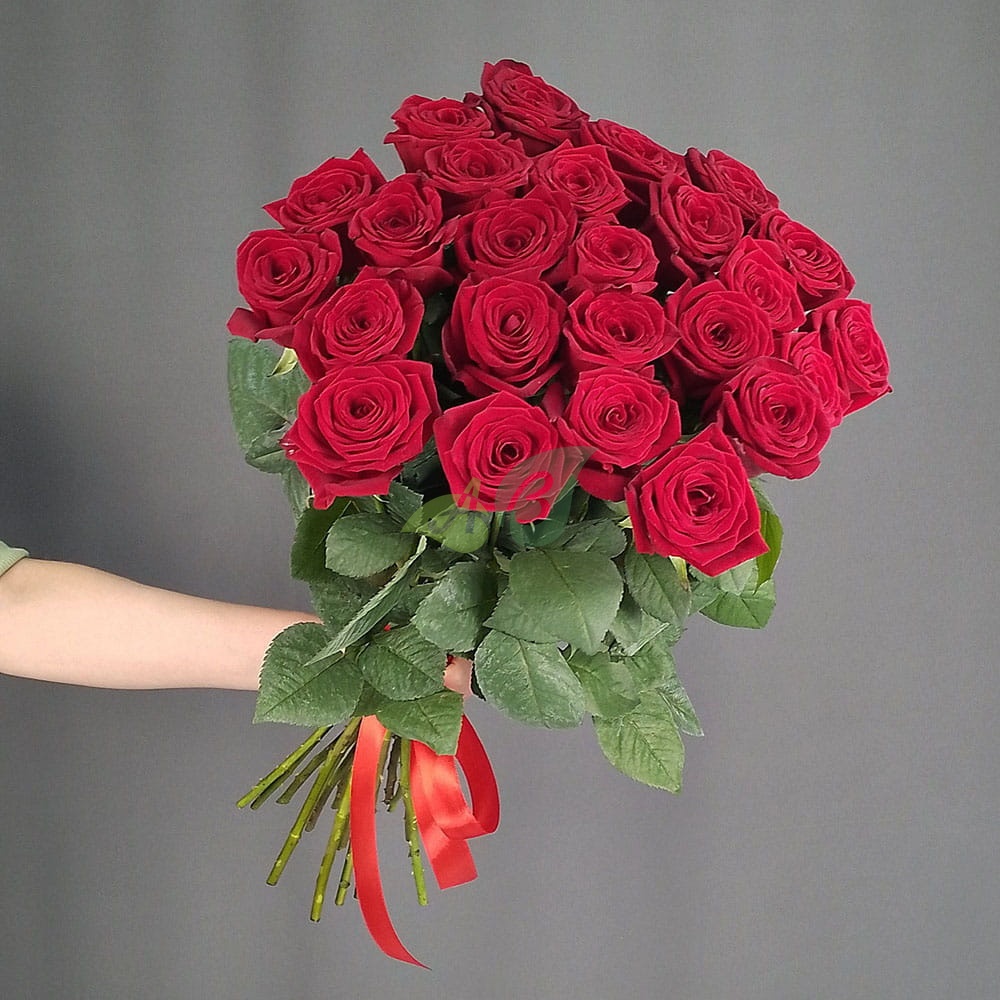 - Роза - 25 штук, цвет - красный, длина стебля - 60 см;