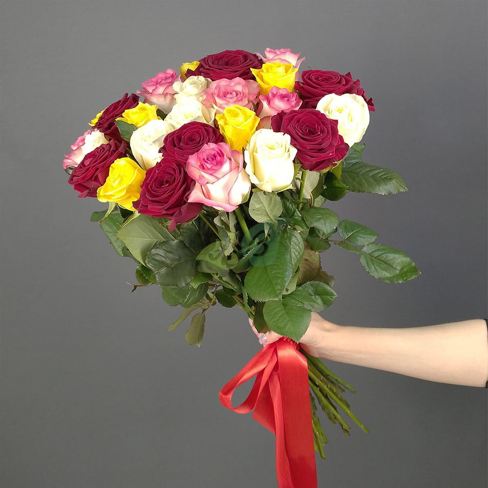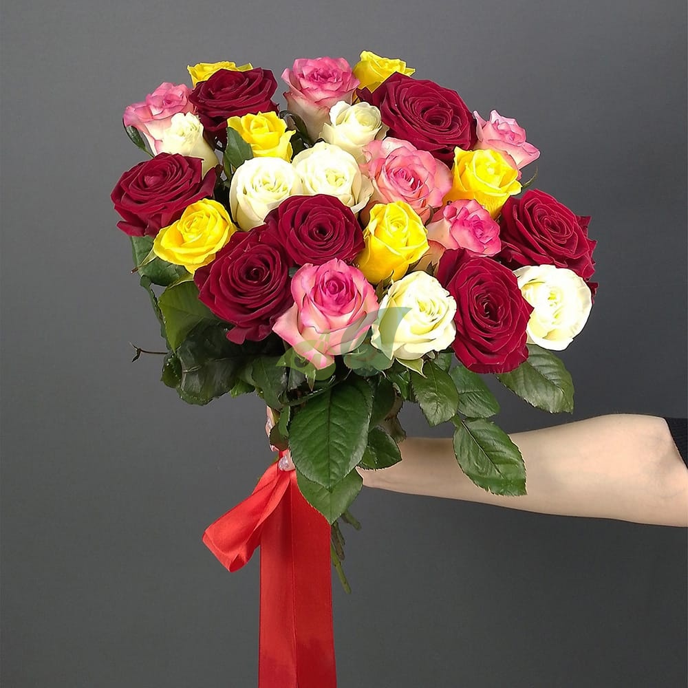 Свежие красные, розовые и желтые розы в единой композиции из 25 штук будут радовать получателя не один день. А их аромат напомнит о весне.